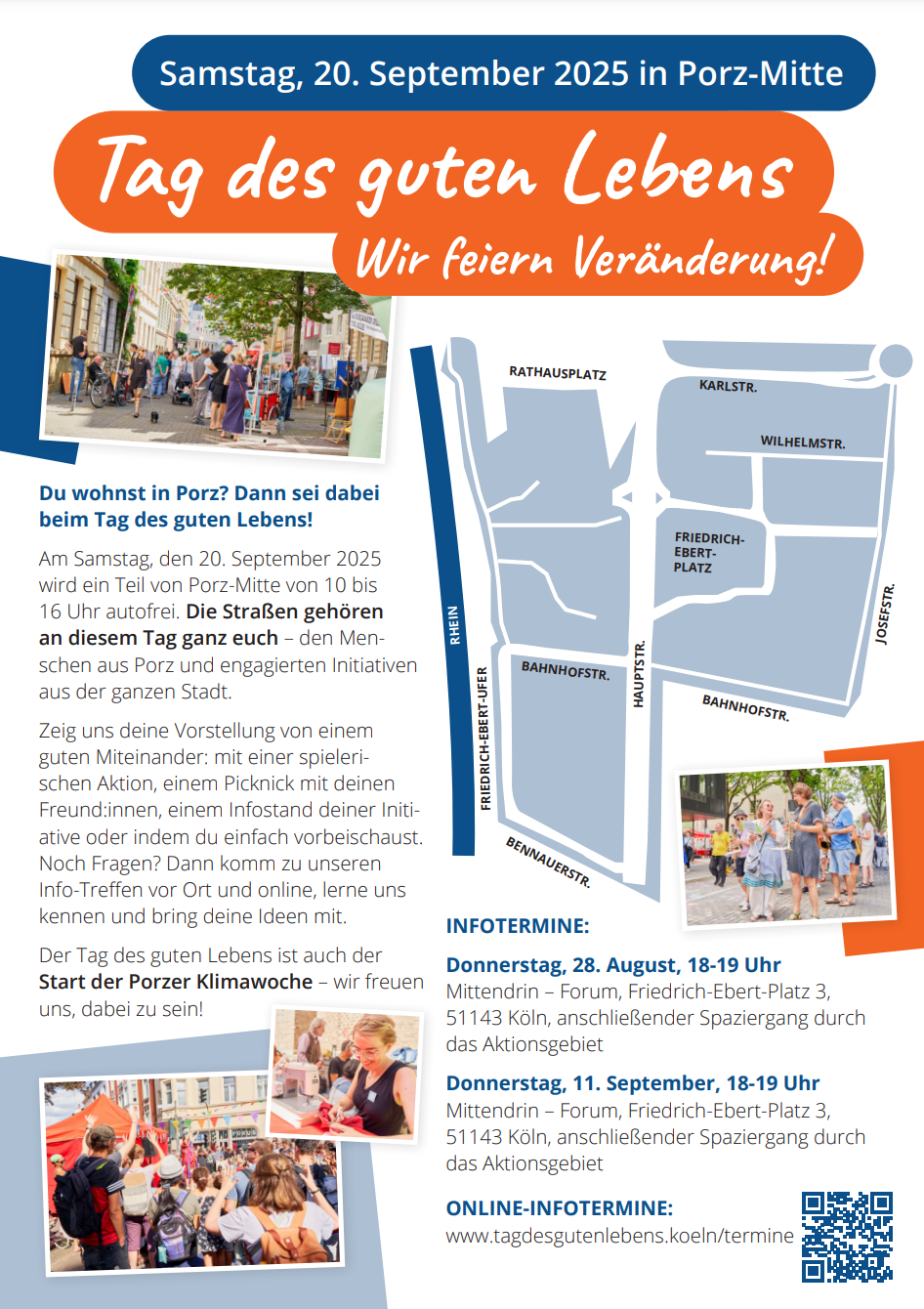 Organisiert wird der Tag von Agora Köln e.V. in Kooperation mit der Sozialraumkoordination Porz, dem Büro Porz-Mitte, dem Bündnis Porz-Mitte und dem Porzer Klimatreff, und gefördert durch die Stadt Köln. Weitere Infos und das vollständige Programm gibt es hier: www.tagdesgutenlebens.koeln