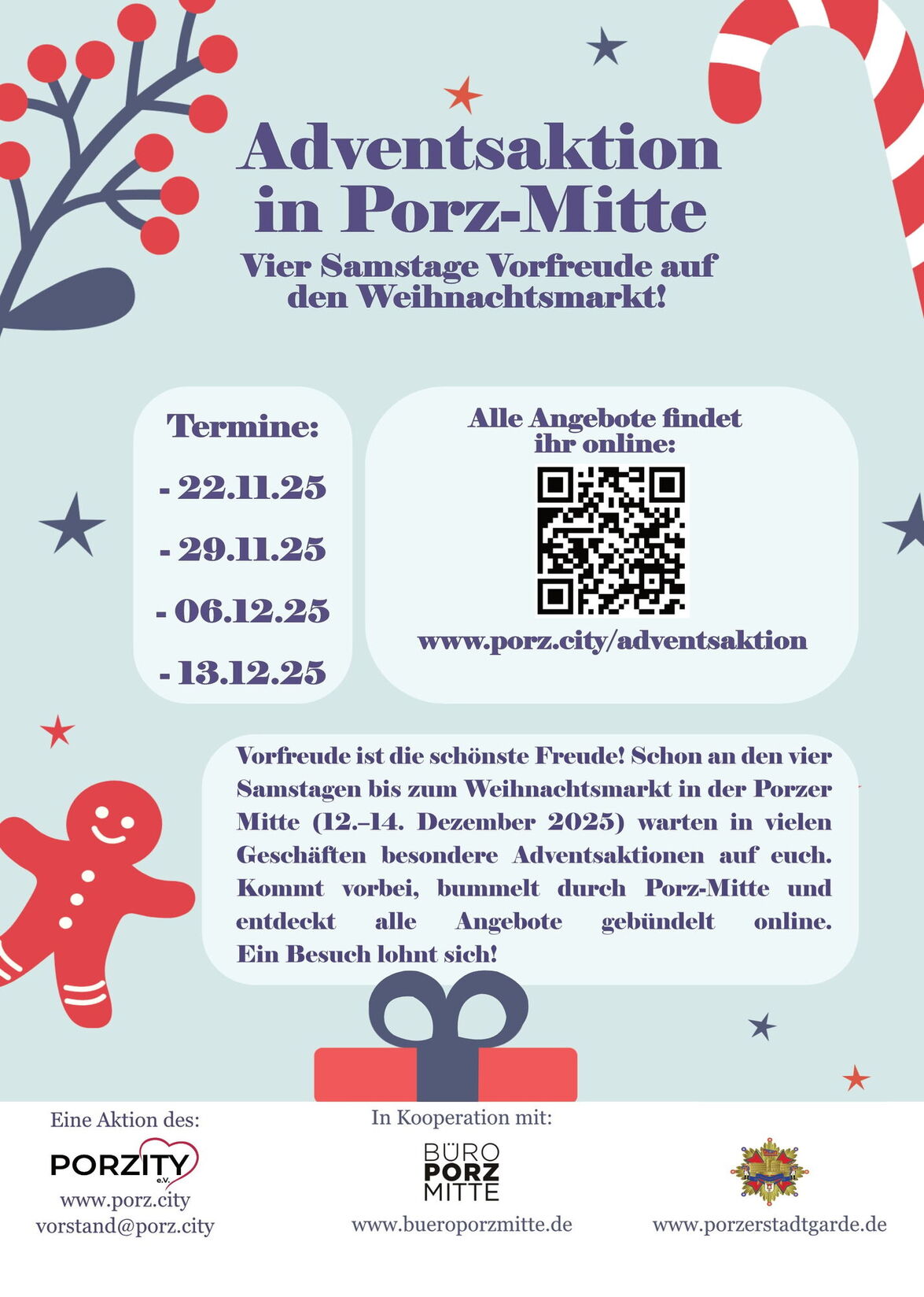 Vier Samstage Vorfreude auf den Weihnachtsmarkt! Auch vor Beginn des Weihnachtsmarktes lässt es sich in Porz schon gut in Weihnachtstimmung bringen. An den vier Samstagen bis zum Weihnachtsmarkt warten in der Porzity bereits besondere Adventsangebote nur darauf von euch entdeckt zu werden. Alle Angebote könnt ihr persönlich in der Stadt aber auch online unter https://porz.city/adventsaktion/ entdecken. Wir wünschen eine Frohe Vorweihnachtszeit!