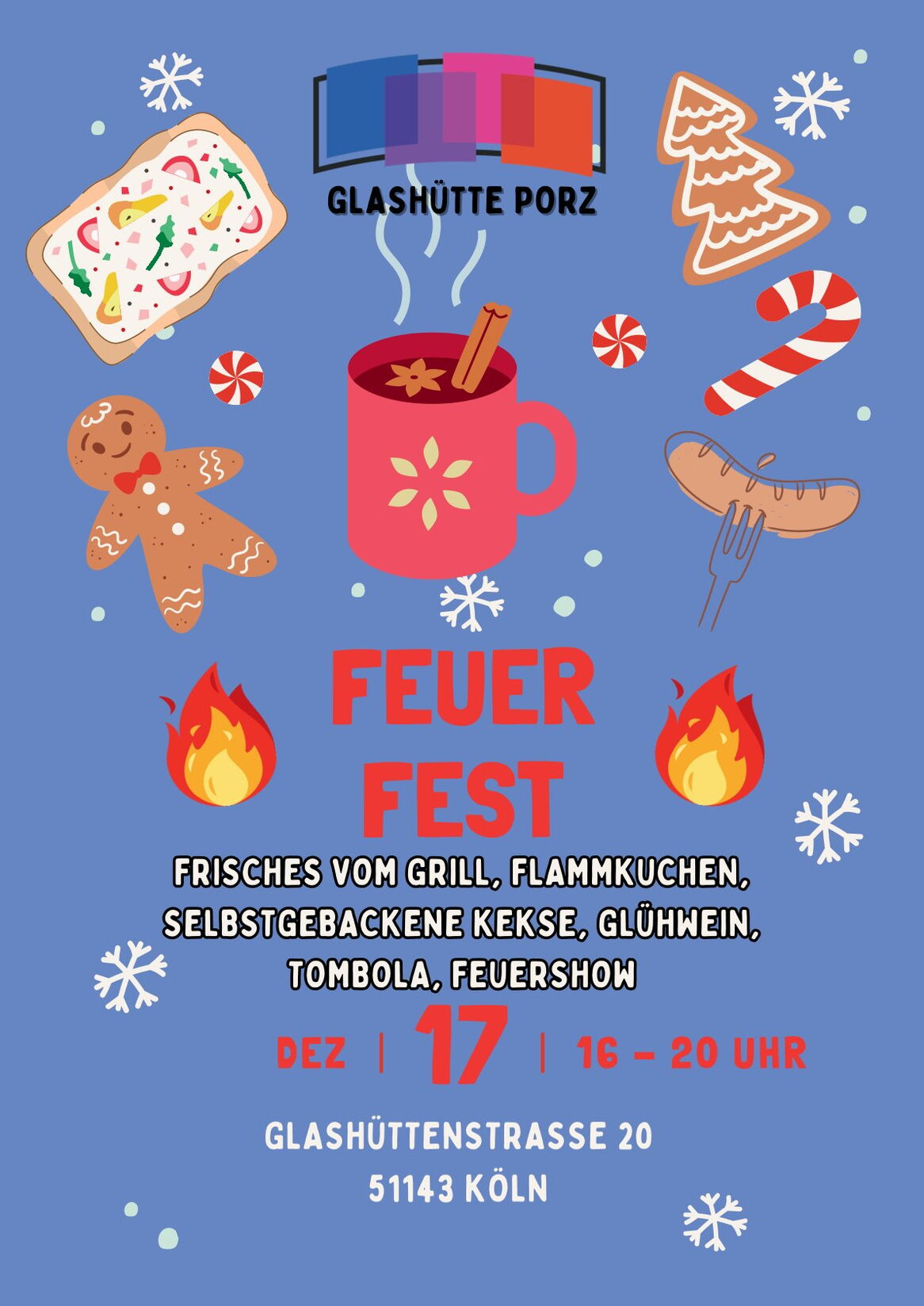 Am 17.12 wird an der Glashütte das Feuerfest gefeiert. Die Glashütte Porz lädt alle herzlich ein, gemeinsam die Vorweihnachtszeit zu genießen! Von 16:00 bis 20:00 Uhr erwartet euch Frisches vom Grill, Flammkuchen, Kekse und Glühwein. Es wird auch eine Tombola und selbstverständlich die Feuershow als Höhepunkt des Abends geben.
