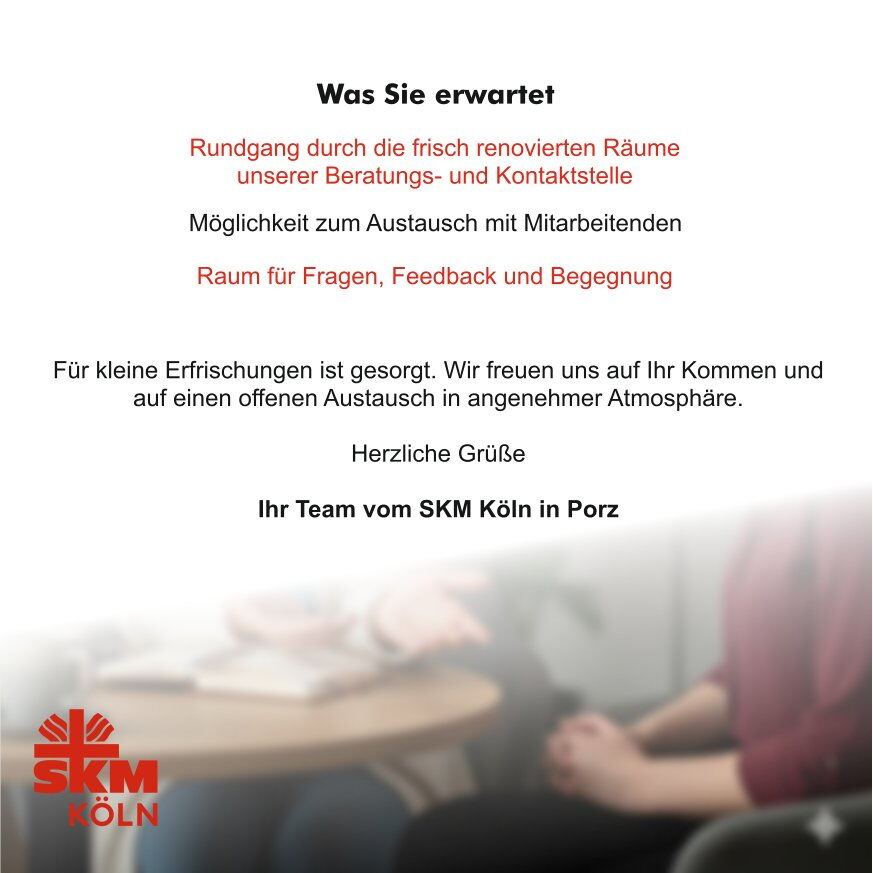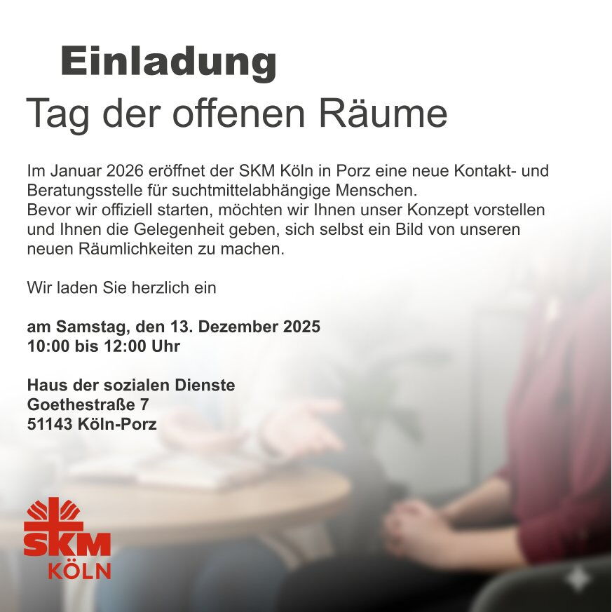 Im Januar 2026 eröffnet der SKM Köln in Porz eine neue Kontakt- und Beratungsstelle für suchtmittelabhängige Menschen. Bevor die Türen offiziell geöffnet werden, lädt das Team alle Interessierten herzlich ein, das Konzept kennenzulernen und die frisch renovierten Räume zu besichtigen.