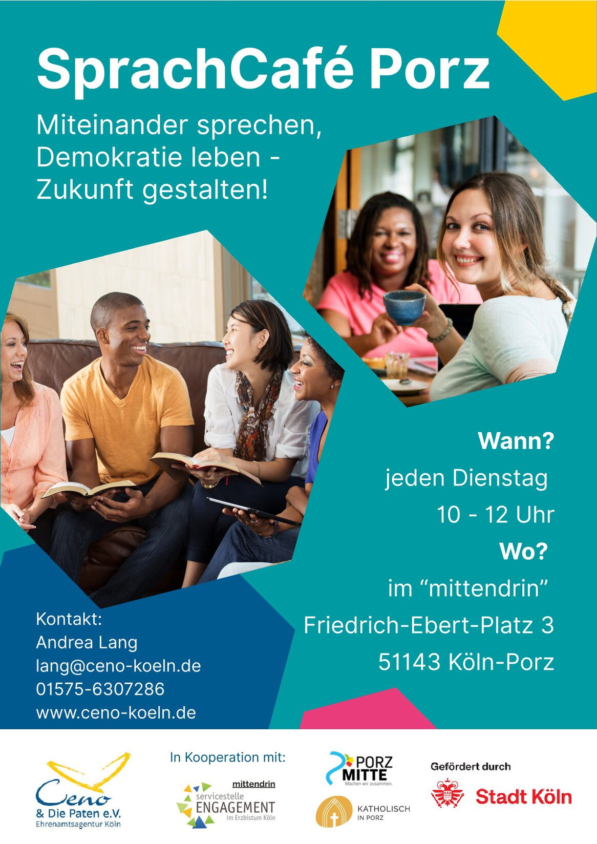 Unter dem Motto „Miteinander sprechen, Demokratie leben – Zukunft gestalten!“ bietet das Sprachcafé Porz einen offenen Raum für Begegnung, Austausch und gemeinsames Lernen. Eingeladen sind alle Menschen, die ihre Deutschkenntnisse verbessern, neue Kontakte knüpfen oder einfach ins Gespräch kommen möchten – unabhängig von Herkunft oder Sprachniveau.