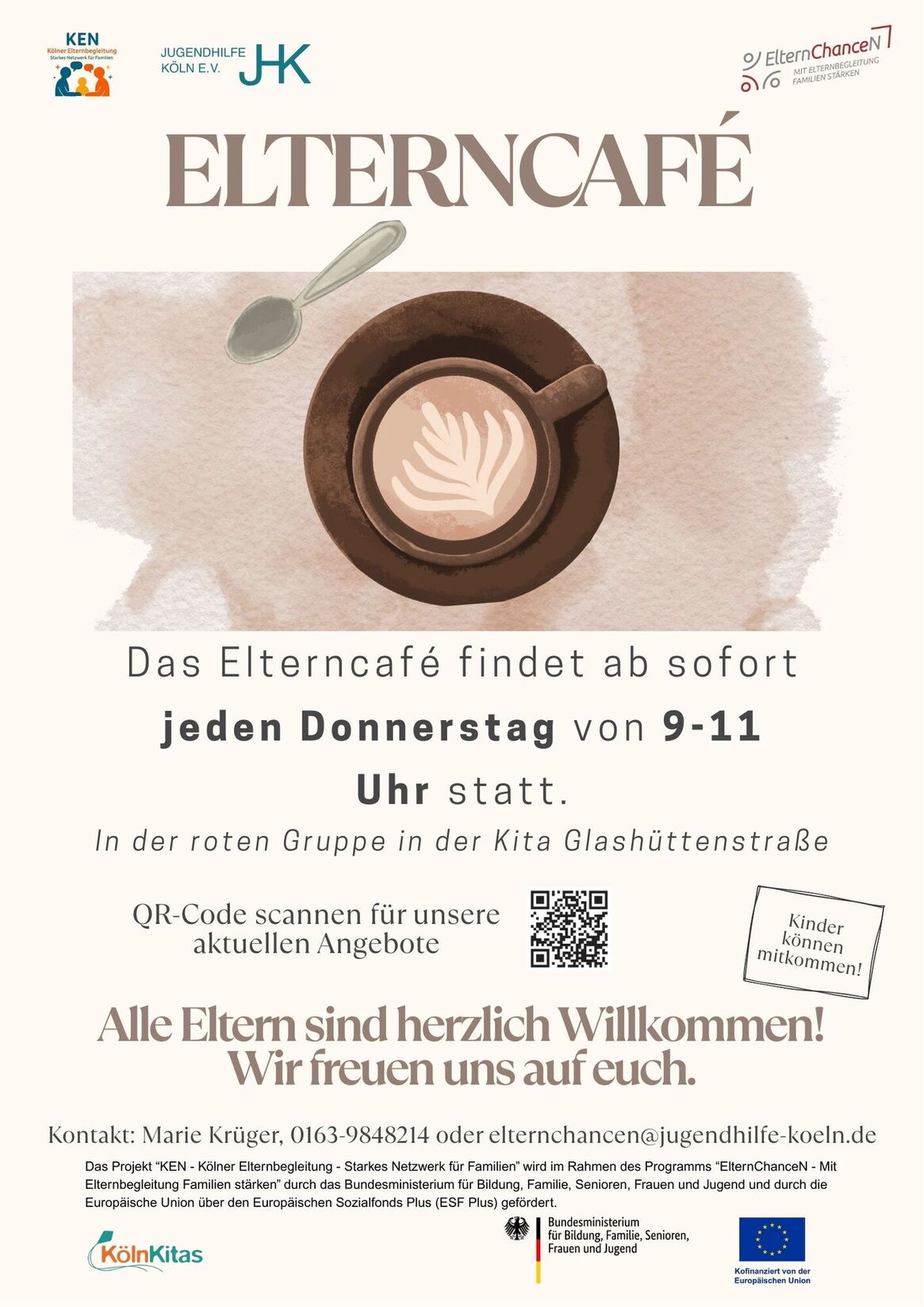 Das Elterncafé findet ab sofort regelmäßig jeden Donnerstag von 9 bis 11 Uhr in der Gruppe Rot der Kita Glashüttenstraße statt. In entspannter Atmosphäre haben Eltern die Möglichkeit, sich bei Kaffee miteinander auszutauschen, ins Gespräch zu kommen und gegenseitige Erfahrungen zu teilen. Kinder sind dabei herzlich willkommen.