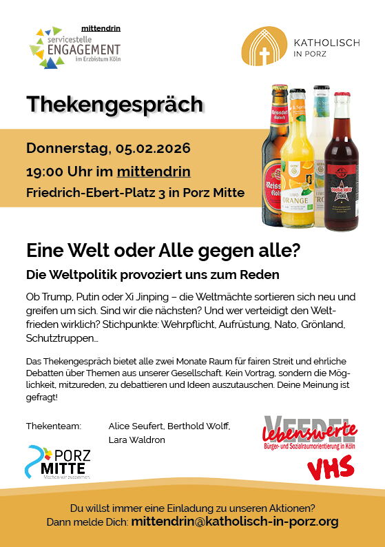 Das Mittendrinn lädt am 05.02.2026 um 19:00 Uhr erneut zum Thekengespräch ein. Dieses Mal zum Thema „Eine Welt oder Alle gegen alle? - Die Weltpolitik provoziert uns zum Reden“.