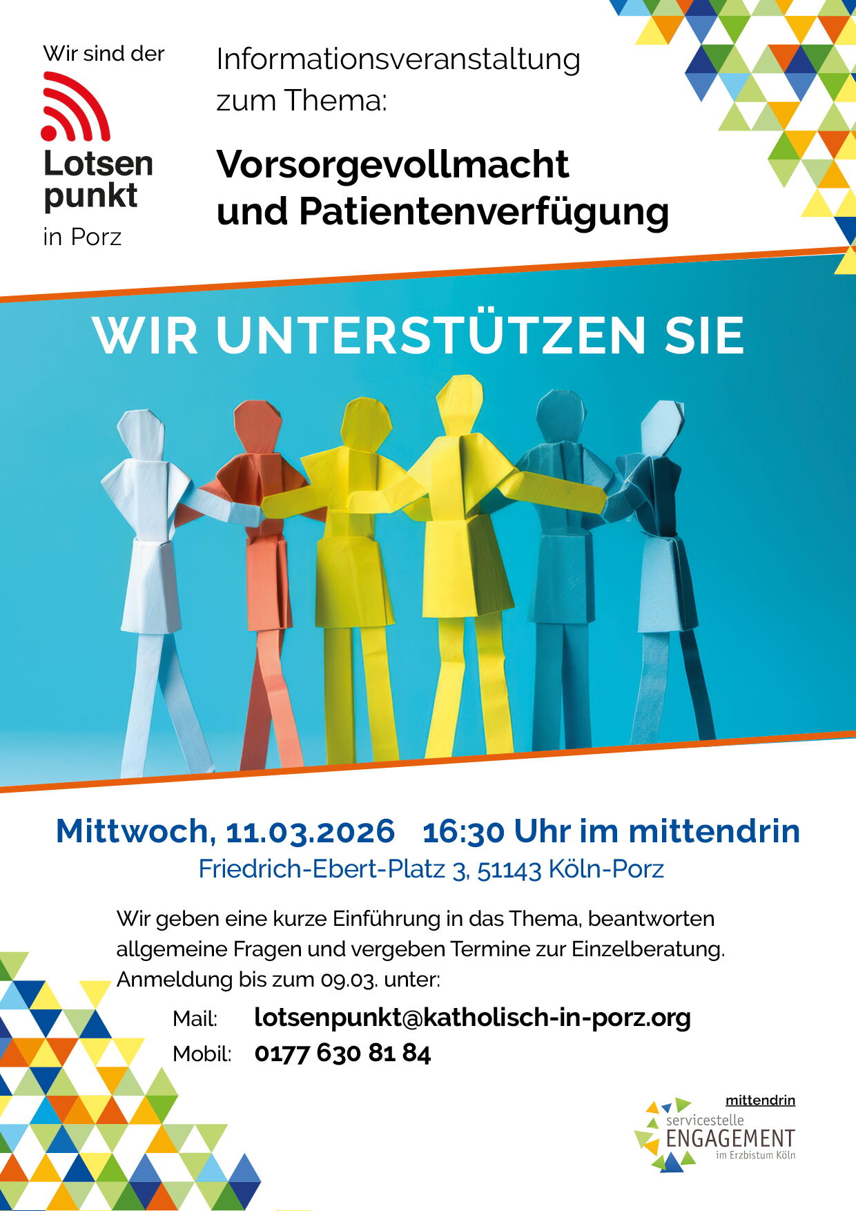 Der Lotsenpunkt in Porz lädt am Mittwoch, den 11. März 2026, um 16:30 Uhr zu einer Informationsveranstaltung im "Mittendrin" (Friedrich-Ebert-Platz 3, 51143 Köln-Porz) ein.