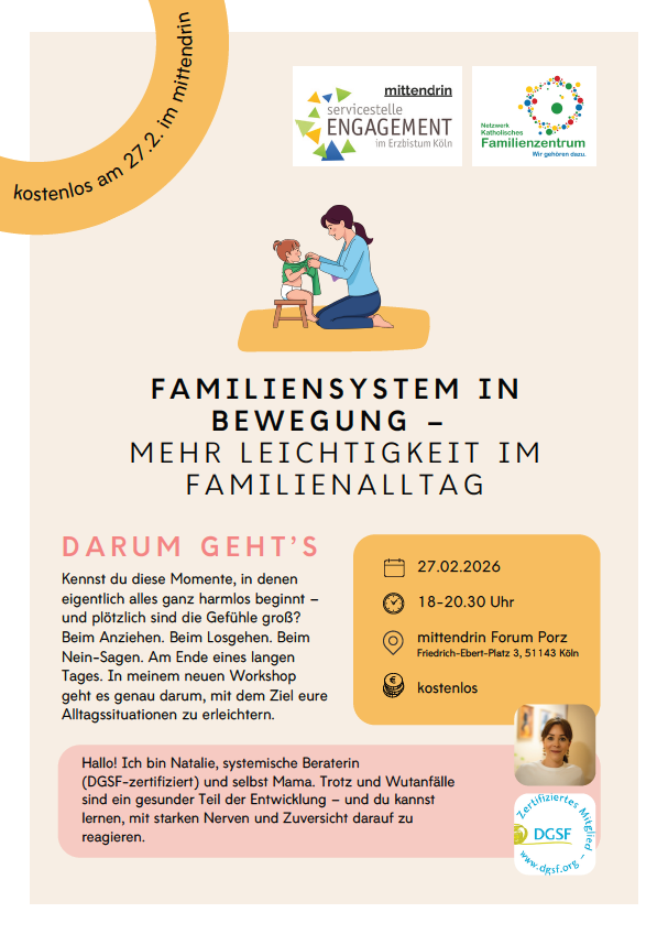 Am 27.02.2026 wird im Mittendrin (Friedrich-Ebert-Platz 3,51143 Köln) ein kostenloses Beratungsangebot für Eltern Angeboten. Die systemische Beraterin Natalie, spricht mit Ihnen über ihre Probleme im sich rasend Verändernden Familienalltag. was ist das Ziel? Den Trotz und die Wut der Kinder einzuordnen und zu üben auf diese gelassen zu reagieren, damit auch am Ende eines langen Tages kein Wutausbruch zum Familiendrama werden muss.