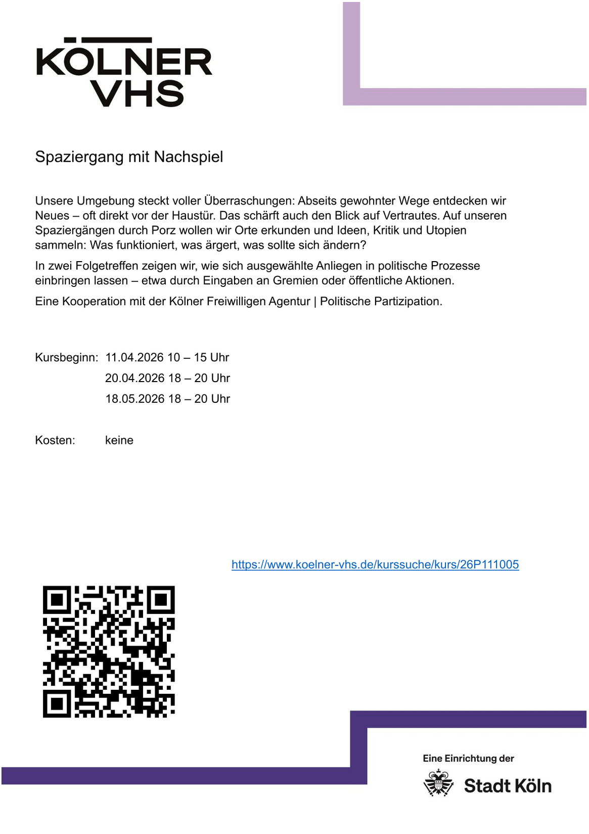 In zwei Treffen danach zeigen Ihnen die Kölner VHS und Freiwilligenagentur, wie man solche Anliegen tatsächlich in die lokale Politik einbringen kann, zum Beispiel durch Anträge an Gremien oder kleine öffentliche Aktionen.