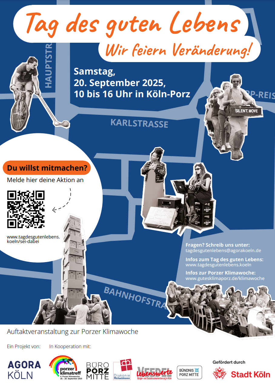 Organisiert wird der Tag von Agora Köln e.V. in Kooperation mit der Sozialraumkoordination Porz, dem Büro Porz-Mitte, dem Bündnis Porz-Mitte und dem Porzer Klimatreff, und gefördert durch die Stadt Köln. Weitere Infos und das vollständige Programm gibt es hier: www.tagdesgutenlebens.koeln